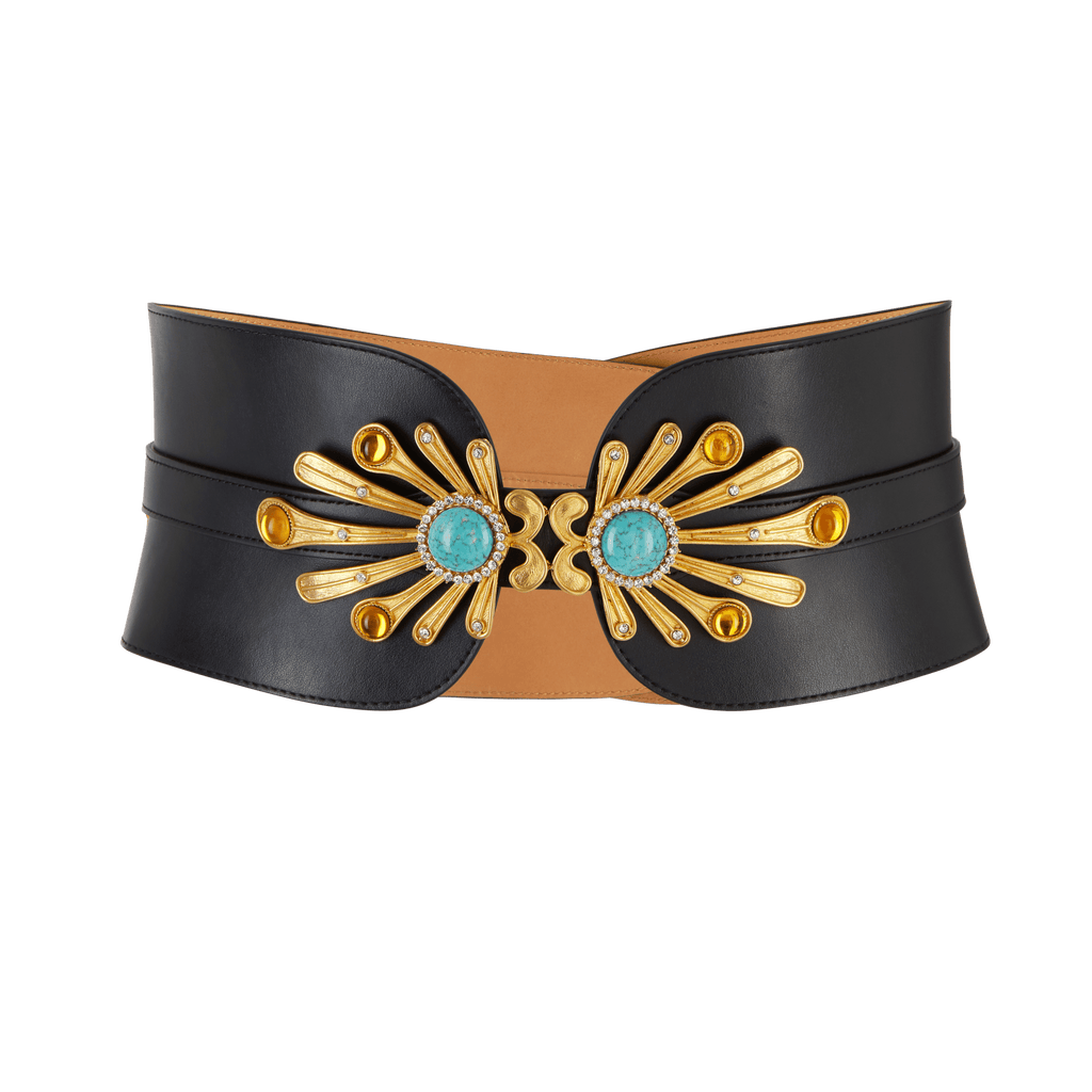 Genuine Italian leather, brass with 24k gold overlay, simulated turquoise cabochon, coloured resin cabochons and Swarovski rhinestones. Pierced Setting