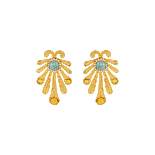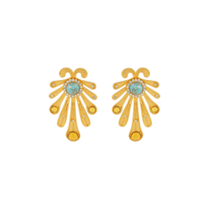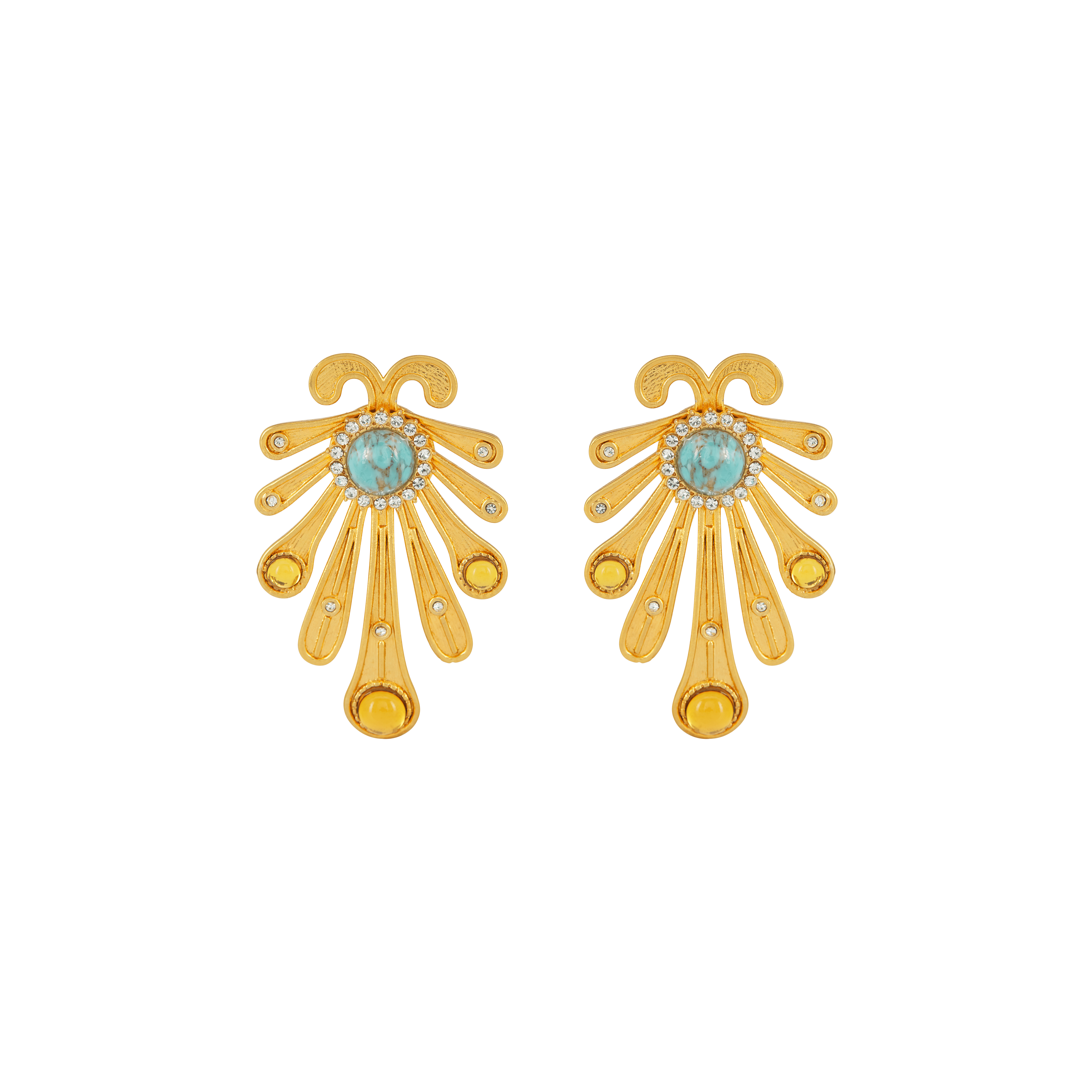 The Kiss Fish Earrings capture the whimsical essence of Sonia Petroff's latest collection. Inspired by a glimpse into the garden pond, these earrings feature simulated turquoise cabochons, coloured resin cabochons, and Swarovski rhinestones set in brass with a 24k gold overlay.