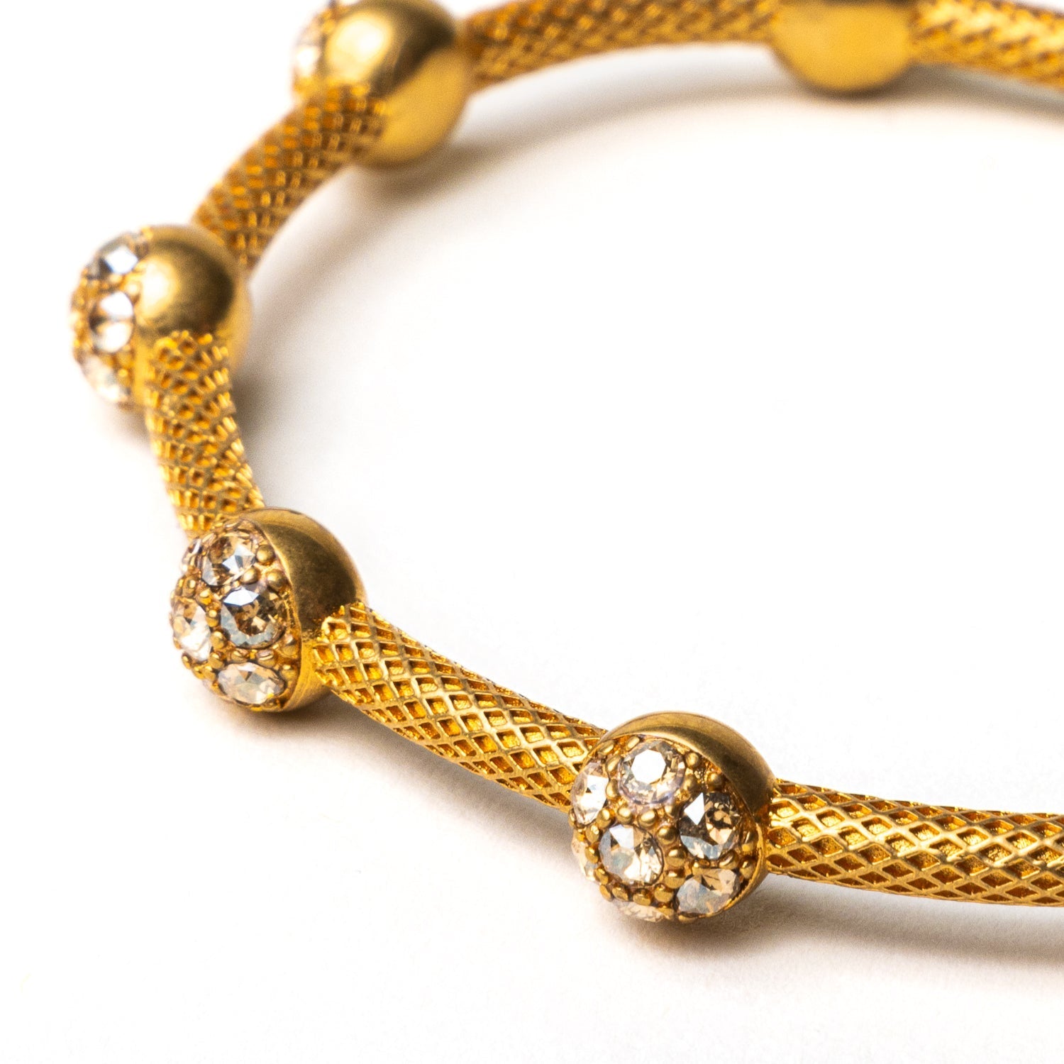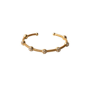 Part of our Lamu collection are these stunning Reef bracelets. The textured gold is reminiscent of the beautiful coral reefs found in the Lamu archipelago. Made of 24K gold overlay, the sparkling Swarovski crystals reflect the water colours seen in the Indian Ocean from sunrise to sunset. These luxury bracelets are so easy to wear and can be dressed up or worn casually, complementing any look or time of day. Also change your look by getting a few and stacking them!