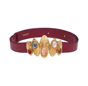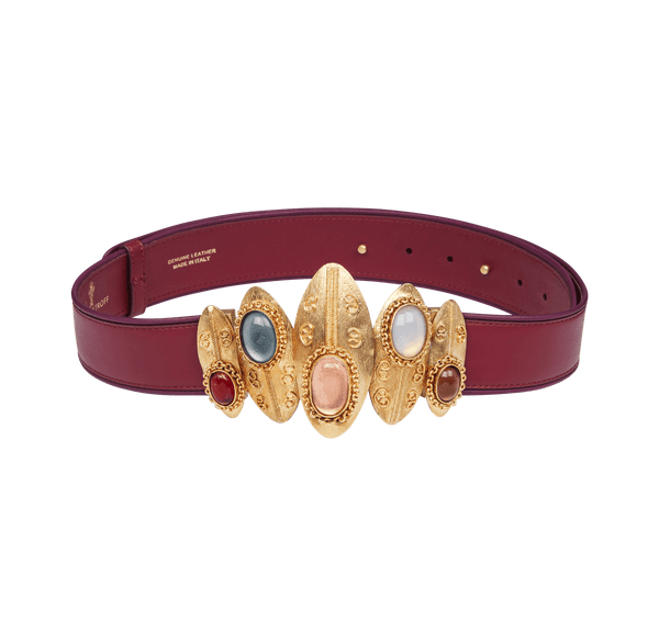 Simulated gemstone cabochons, 24 carat gold overlay, dark pink leather with purple piping.