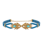 This belt has a buckle designed as a pair of dragon fish in the Rococo style with undulating scales. The body is set with a pear-shape, simulated white agate cabochon and an oval, simulated turquoise cabochon, completed by a braided turquoise leather double loop belt with handcrafted spacers decorated with rope twists.