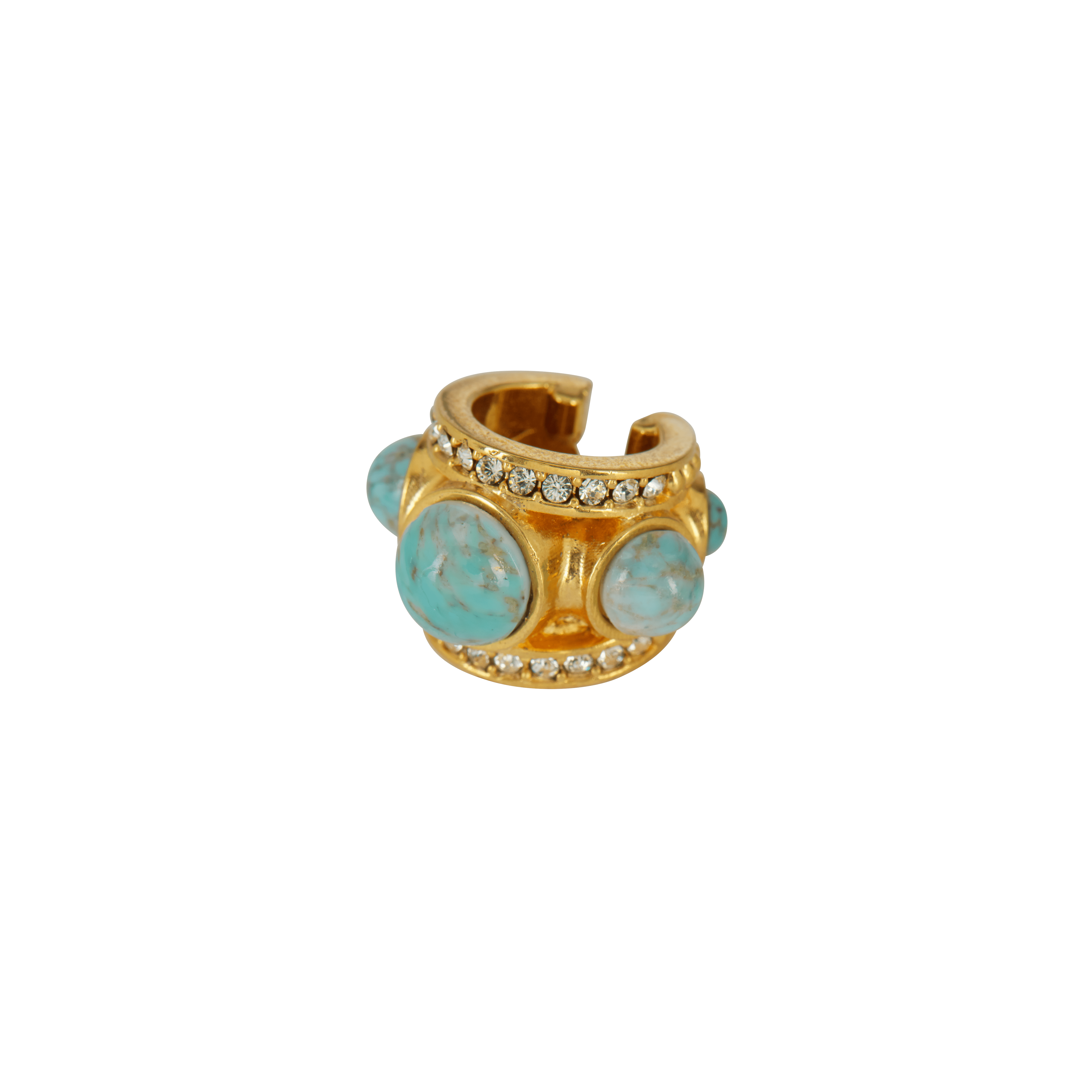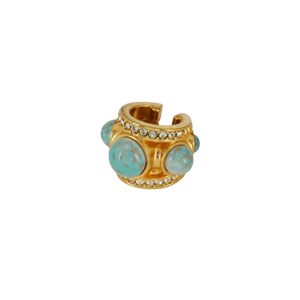 Sonia's designs reflects her bold spirit and commitment to elegance, from her luxurious use of materials to her intricate craftsmanship. Drawing inspiration from the extravagant styles of the 60s and 70s, Sonia Petroff's Cascata Ear Cuff with turquoise simulated cabochons is a testament to her visionary design.