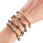 Part of our Lamu collection are these stunning Reef bracelets. The textured gold is reminiscent of the beautiful coral reefs found in the Lamu archipelago. Made of 24K gold overlay, the sparkling Swarovski crystals reflect the water colours seen in the Indian Ocean from sunrise to sunset. These luxury bracelets are so easy to wear and can be dressed up or worn casually, complementing any look or time of day. Also change your look by getting a few and stacking them!