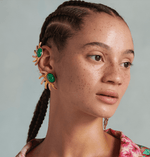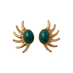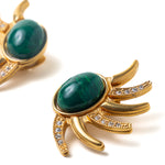 Inspired by the sun and a vintage design, these handcrafted earrings hold a wealth of unique artistry behind every smooth line and decorative accent. Vibrant simulated malachite cabochon stones nestle in the center of each hand-designed earring. Sun rays fan out on the sides embellished with round brilliant cut Swarovski diamonds. Created in a luxurious 24k gold overlay finish with clip-backs.
